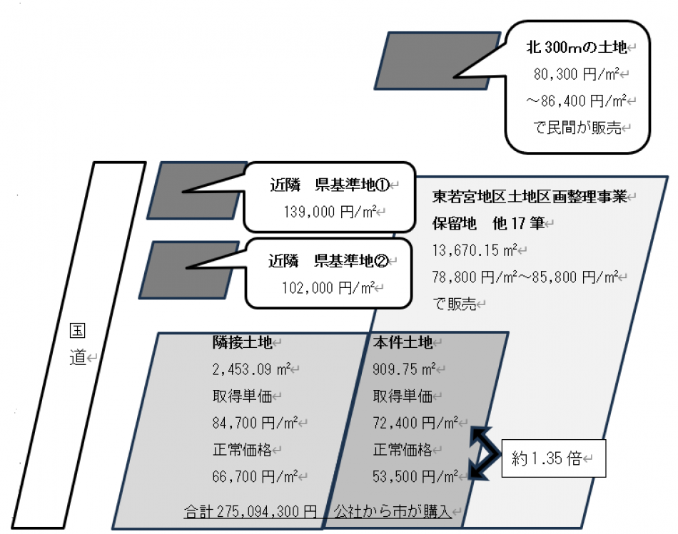 公共用地の取得においては、正常価格で取得することが原則(※1)であるが、本件は、正常価格によらず、取得している。